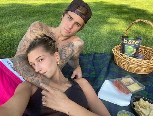 사진 속 저스틴 비버와 헤일리 볼드윈 부부는 잔디밭 위에 돗자리를 깔고 피크닉을 즐기고 있다.