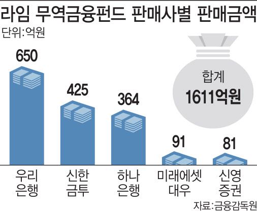 한편 금감원 권고안이 적용되는 라임 무역금융펀드 판매액은 총 1611억원이다. 판매사별로는 우리은행(650억원), 신한금융투자(425억원), 하나은행(364억원), 미래에셋대우(91억원) 등이다.