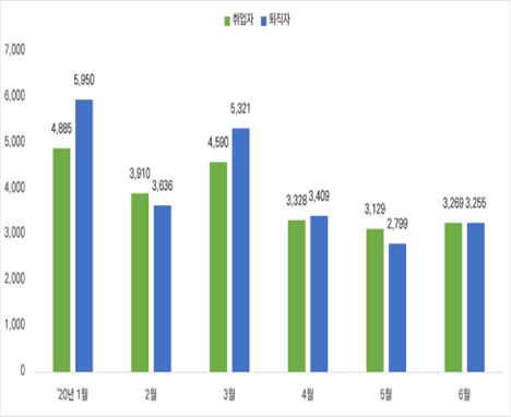 또 취업자는 신규취업자와 이직자를 포함해 감소추세며, 1월에 4,885명을 기록했으나 꾸준히 줄어 6월에는 3,269명에 그쳤고, 상반기 누적 취업자 수는 2만 3,111명으로 지난해 2만 5,980명 대비 11.0% 감소했다.