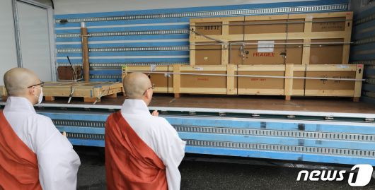 (인천공항=뉴스1) 민경석 기자 = 6·25 전쟁 직후 미국으로 유출됐던 '영산회상도(靈山會上圖)'와 '시왕도(十王圖)'가 29일 오후 인천국제공항 화물터미널을 통해 국내로 환수돼 차량에 옮겨져 있다.