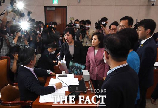 통합당 의원들은 위원장석과 여당 쪽으로 다가가 "소위 구성하라면서 상정을 왜 하냐, 불법이다(김도읍)", "법은 아시는 분이 맞냐. 이러려고 법사위원장 가져갔냐. 이게 민주화 세력인가. 민주당이 다 해드시라(조수진)"라며 따졌다. 그러자 여당에서는 백혜련 의원과 김남국, 김용민 의원 등이 앞으로 나가 서로 삿대질하며 목소리를 높이는 상황이 벌어졌다.