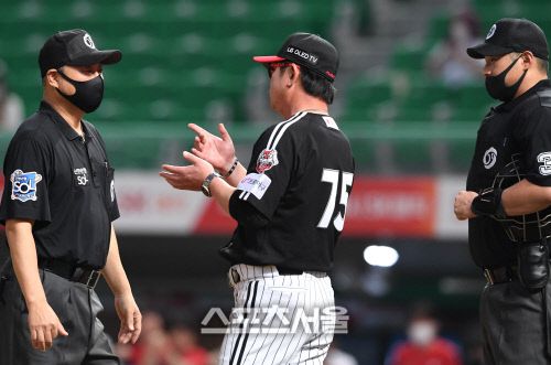 LG 트윈스 류중일(가운데) 감독이 28일 문학 SK전에서 4-2로 앞선 4회 상대 선발 <핀토>의 보크 의혹에 대해 어필하고있다. 김도훈기자 dica@sportsseoul.com |