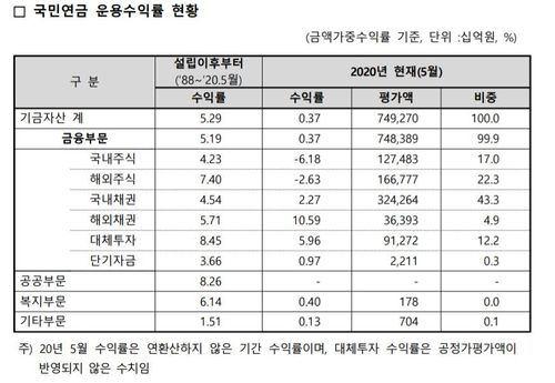 국민연금공단 기금운용본부는 연초 이후 5월까지 기금 수익률이 0.37%로 잠정 집계됐다고 30일 공시했다.