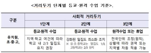 이날 발표된 방안에는 2학기 등교·원격 수업 기준도 포함됐다. 정부 차원에서 마련된 사회적 거리두기 단계를 준용했다. 1단계는 학교 내 밀집도 3분의 2 이하 유지 권장, 2단계는 유·초·중학교는 밀집도 3분의 1 이하, 고등학교는 3분의 2 이하 유지, 3단계는 원격 수업이나 휴교에 해당한다. 현재는 1단계이며 2학기 등교 방침 역시 현 단계가 유지된다는 것을 전제로 마련됐다. 다만 교육부는 “감염 확산 위험이 큰 지역이나 과대·과밀 학교의 경우 밀집도 3분의 2 이하 조치를 지켜달라”고 강력 권고했다.