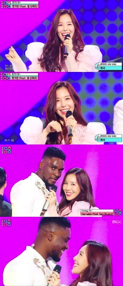 방송인 샘 오취리의 유쾌한 피쳐링과 함께 무대에 오른 한가빈은 화려한 의상과 환상적인 퍼포먼스로 '자기! 아~' 무대를 완성했다.