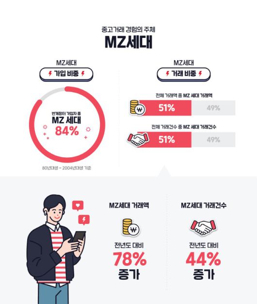 최근 중고거래 플랫폼 번개장터가 발표한 'MZ세대 검색 및 거래 트렌드' 보고서에 따르면 올해 상반기 번개장터 가입자와 거래액을 분석한 결과, 이용자의 84%이상이 MZ세대로 나타났다. 이들의 거래건수와 거래액은 전체의 51%를 차지했다.