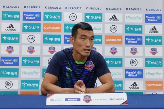 수원FC 조원희가 1일 수원종합운동장에서 열린 안산 그리너스와의 K리그2 경기를 마친 뒤 취재진과 인터뷰를 하고 있다. 류재민 기자 phoem@seoul.co.kr |