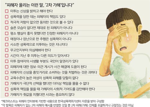 이러한 문제의식에 따라 최근 2차 가해의 정의 및 징계 절차 등을 구체적으로 규정하고, 강력히 조치해야 한다는 목소리가 대두되고 있다. 본지는 한국성폭력위기센터에 자문해 2차 가해가 될 수 있는 16개 예시 항목을 체크리스트 형태로 구성했다. ‘미투는 신상을 밝히고 하지 않으면 인정할 수 없다’, ‘사소한 성폭력 피해로 미투하는 건 과하다’, ‘가해자가 조직을 떠나거나 극단적 선택을 했다면 더 이상 책임을 묻지 않아도 된다’ 등이 항목에 포함됐다. 조소연 사무국장은 “이 같은 2차 가해 양상을 사회가 인지하고 주의함으로써, 피해자다움에 대한 통념에서 벗어나 피해자를 보다 잘 이해할 수 있게 될 것”이라고 밝혔다.