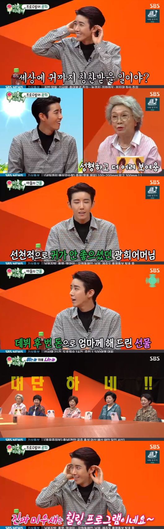 광희는 "어릴 때부터 선천적으로 귀가 안 좋았던 어머니, 인공고막을 해드렸다"면서 데뷔 후 번 돈으로 해드린 선물이라 했고 母들은 "진짜 효자다"며 덩달아 감동했다.