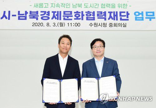 (수원=연합뉴스) 김인유 기자 = 경기 수원시와 남북경제문화협력재단(경문협)은 3일 수원시청에서 '새롭고 지속적인 남북 도시 간 협력을 위한 협약'을 체결했다.