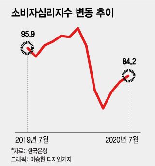 지난달 29일 한국은행이 발표한 '2020년 7월 소비자동향조사'에 따르면 7월 소비자심리지수(CCSI)는 전월(81.8)보다 2.4포인트 오른 84.2포인트로 나타났다. 소비자심리지수(CCSI)는 소비자동향지수(CSI)를 구성하는 15개 지수 가운데 현재생활형편·생활형편전망·가계수입전망·소비지출전망·현재경기판단·향후경기전망 6개 지수를 이용해 산출한 지표로, 장기평균(2003∼2019년)치인 100포인트보다 높으면 소비심리가 긍정적이고 낮으면 소비심리가 비관적임을 의미한다.