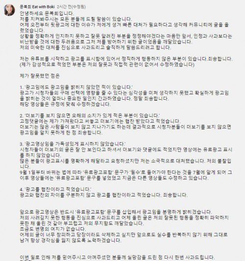 문복희는 "저는 유튜브를 시작하고 광고를 표시함에 있어서 정직하게 행동하지 않은 부분이 있다. 죄송하다"며 "제가 잘못했던 점은 광고임에도 광고임을 밝히지 않은 것, 더보기를 보지 않으면 오해의 소지가 있게 적은 부분, 광고 영상임을 가독성 있게 표시하지 않은 것, 광고를 협찬이라고 적은 부분이다"라고 밝혔다.