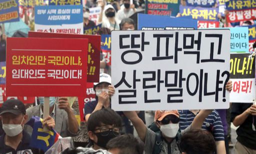 지난 1일 서울 여의도에서 6·17규제소급적용 피해자모임, 임대사업자협회 추인위원회 등 부동산 관련단체 회원들이 정부의 부동산 규제에 반대하는 집회를 열고 임대차 3법 반대 등의 구호를 외치고 있다. 연합뉴스 |