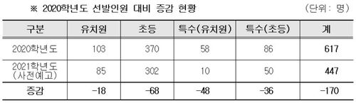이는 교원 정년·명예퇴직, 학생·학급수 감축 등을 고려한 것이다. 선발 인원은 올해(2020학년도 시행계획 기준 617명)보다 170명(27.6%) 감소했다.