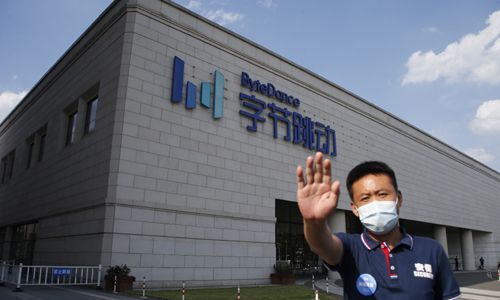3일(현지시간) 소셜미디어 앱 ‘틱톡’을 보유한 바이트댄스의 중국 베이징 본사 건물 앞에서 회사 직원이 사진 촬영을 막기 위해 손을 뻗고 있다. 베이징=EPA연합뉴스 |