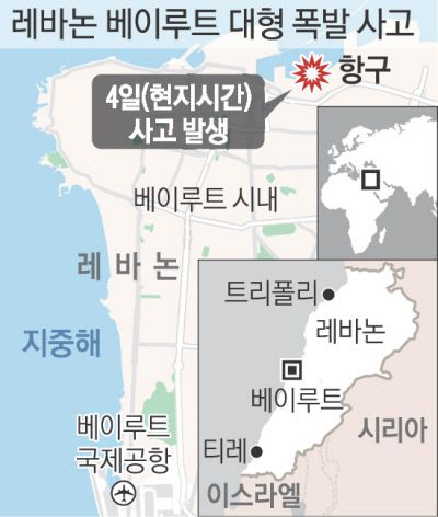 4일 오후 6시쯤(현지시간) 레바논 수도 베이루트 항구에서 굉음과 함께 검붉은 연기가 치솟았다. 인화성 물질 질산암모늄을 보관한 것으로 추정되는 창고에서 대규모 폭발이 일어난 것이다. 5일 오전 6시 현재 이번 폭발로 인한 사망자는 100여명, 부상자는 4000여명으로 파악됐다. 도시 절반이 피해를 입어 30만명이 갈 곳을 잃었다. 피해액은 30억달러(3조5700억원)를 넘을 것으로 추산됐다. 당국은 폭발 원인을 두고 조사에 들어갔다.