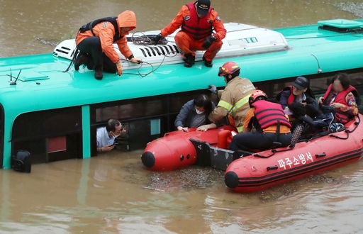 경기도 파주서 시간당 100㎜ 역대 최고급 폭우에 운행 중이던 시내버스가 빗물에 잠겨 소방당국이 구조에 나섰다.