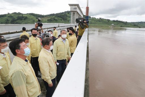 문 대통령은 이날 오후 강기정 청와대 정무수석비서관과 이진석 국정상황실장, 김광철 연천군수 등과 군남 홍수 조절댐에 도착해 현장 관계자로부터 운영상황과 대응 등을 먼저 보고받았다.