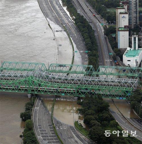 6일 서울 용산구와 동작구를 잇는 한강철교 아래 올림픽대로가 한강 수위가 상승하며 침수돼 있다. 한강에 홍수주의보가 발령된 건 2011년 7월 이후 9년 만이다. 송은석 기자 silverstone@donga.com |