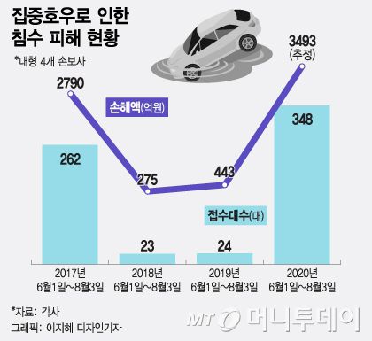 한 대형 손보사 관계자는 “약 2주일에 걸친 단기 집중호우만으로 이 정도의 대규모 침수 피해가 발생한 것은 전례가 없는 일”이라며 “통상 여름철 호우가 자동차보험 손해율 미치는 영향은 약 3~4%대인데 올해는 그 이상인 4~5% 이상이 될 것으로 예상된다”고 말했다.