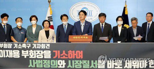 더불어민주당 박용진, 노웅래, 양경숙, 조오섭, 이용선 의원, 정의당 류호정 의원, 열린민주당 강민정 의원과 김태동 지식인선언네트워크 공동대표, 조수진 민변 사무총장 등 사회단체 대표들이 7월 1일 오전 서울 여의도 국회 소통관에서 이재용 삼성전자 부회장 기소 촉구 기자회견을 하고 있다. [연합뉴스 자료사진] |