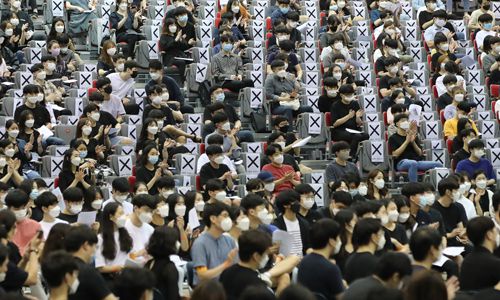 의과대학 정원 확대에 반대하는 전국 전공의가 집단휴진에 들어간 7일 오전 대구 북구 엑스코(EXCO)에서 열린 '2020 젊은의사 단체행동'에 참석한 1600여명의 대구·경북 전공의와 의대생들이 대구·경북 의사회장단의 연대사를 듣고 있다. 뉴스1 |