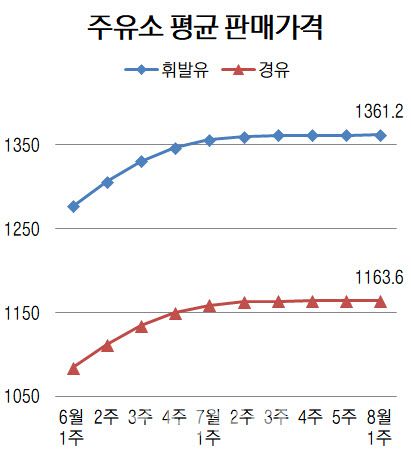 8일 한국석유공사 유가정보서비스 오피넷에 따르면 8월 첫째 주 전국 주유소 휘발유 평균 판매가격은 ℓ당 1361.2원으로 전주보다 0.2원 상승했다.
