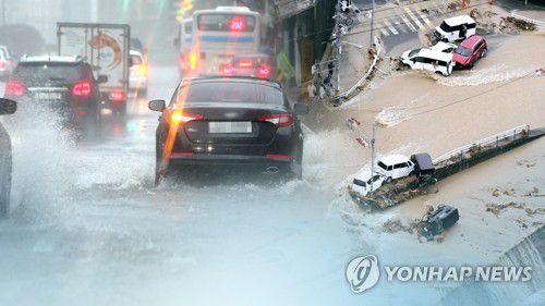 (수원=연합뉴스) 강영훈 김솔 기자 = 경기도 31개 시·군 전역에 호우경보가 발효 중인 가운데 9일 오전부터 계속된 비로 도로 곳곳이 물에 잠겨 차량 통행이 통제되고 있다.