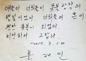 진 전 교수는 두 번째로 문 대통령이 2017년 3월 전남 진도 팽목항 세월호 희생자 분향소 방명록에 "얘들아. 너희들이 촛불광장의 별빛이었다. 너희들의 혼이 1000만 촛불이 되었다. 미안하다. 고맙다"고 적은 것〈사진〉을 꼽았다. 진 전 교수는 "도대체 '고맙다'는 말은 어떻게 이해해야 하느냐. 아직도 나는 그 말의 뜻을 합리적으로 해석할 방법을 못 찾고 있다"고 했다.