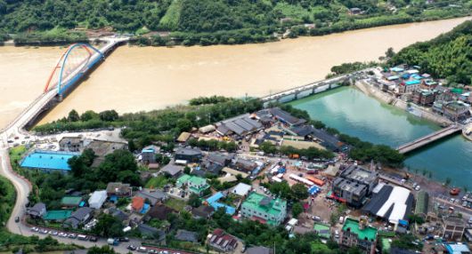 하동 화개장터 침수 현장 - 9일 오후 경남 하동군 화개면 탑리 화개장터 침수 현장 주변으로 섬진강(흙탕물)과 화개천(초록)이 흐르고 있다. 2020.8.9 연합뉴스 |