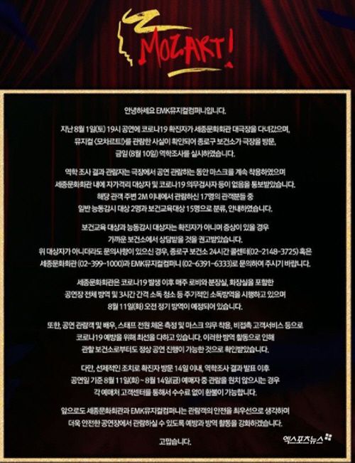 EMK뮤지컬컴퍼니는 10일 SNS에 "지난 8월 1일 19시 공연에 코로나19 확진자가 세종문화회관 대극장을 다녀갔으며, 뮤지컬 '모차르트!'를 관람한 사실이 확인됐다. 종로구 보건소가 극장을 방문, 10일 역학조사를 실시했다"라고 전했다.
