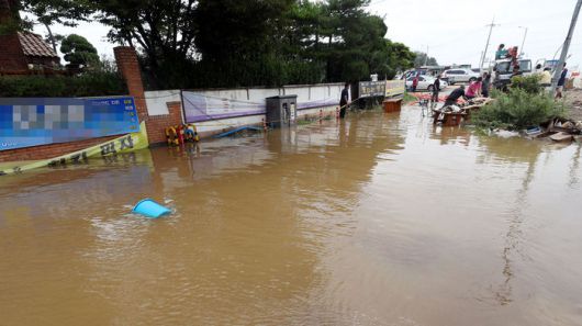 인천시 중구 을왕동 한 골목에 파란색 양동이가 떠 다니고 있다.