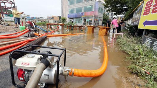인천시 중구 을왕동 한 골목에 양수기들이 가동되고 있다.