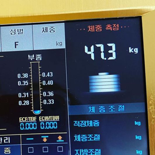 공개된 사진 속에는 체중 측정 결과 47.3kg라는 결과가 담겨있다.