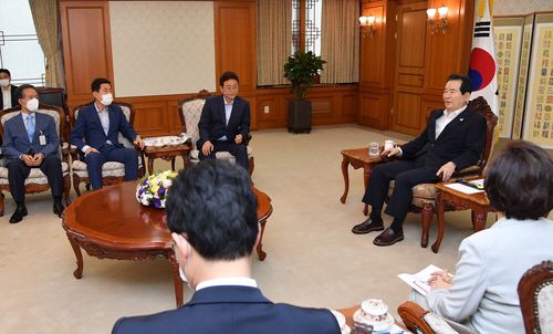이철우 경북도지사와 이강덕 포항시 등이 11일 정세균 국무총리를 찾아 면담을 하고 있다. [사진 제공 = 경북도] |