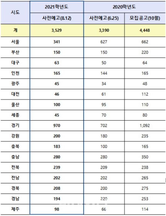 교육부가 전국 시도교육청이 사전 예고한 2021학년도 신규채용 인원은 3529명으로 전년도 모집공고 인원 4448명에 비해 919명 줄어든 것으로 나타났다. 특히 서울은 지난해 모집 공고한 662명의 절반에 가까운 341명을 신규 채용한다고 예고했다. 사전예고 규모만 놓고 봐도 지난해(627명)에 비해 286명 줄어든 수치다. 다만 이는 사전예고 인원이라 향후 늘어날 가능성이 크다. 지난해에도 사전예고 인원은 3390명으로 올해보다 139명 적었지만 같은 해 10월 전국 시도교육청이 실제 공고한 모집인원은 4448명으로 사전예고 대비 1058명 증가했다.