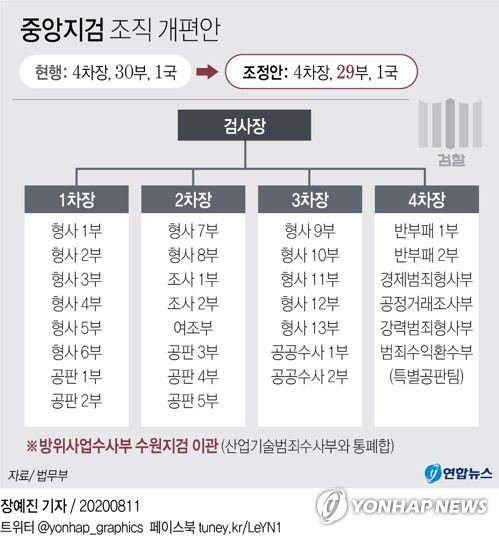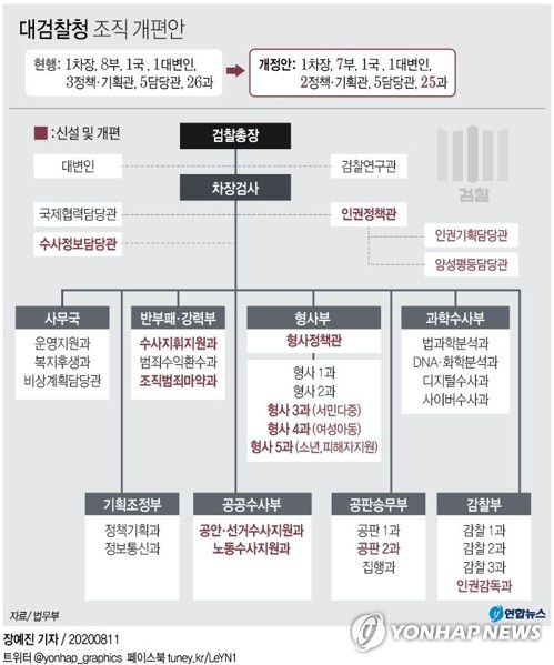 11일 연합뉴스 취재 결과, 법무부는 이날 오전 이 같은 내용이 담긴 A4 10페이지 분량의 '2020년 하반기 검찰청 직제개편(안)'을 대검에 보내 오는 14일까지 의견조회를 요청했다.