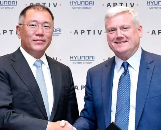 정의선 현대차그룹 수석부회장(왼쪽)과 케빈 클락 앱티브 CEO가 지난해 9월 자율주행 합작법인 본계약을 체결하고 기념촬영을 하고 있다. |