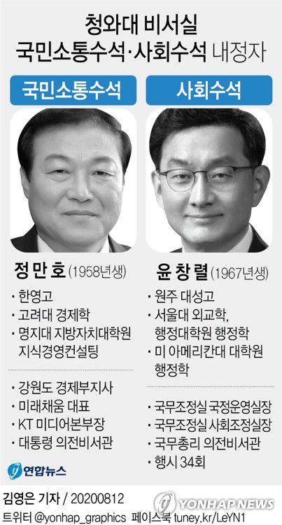 (서울=연합뉴스) 김범현 박경준 기자 = 문재인 대통령은 12일 청와대 국민소통수석에 정만호 전 강원도 경제부지사를, 사회수석에 윤창렬 국무조정실 국정운영실장을 각각 내정했다.
