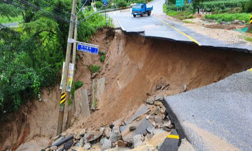 중부지방을 강타한 집중호우로 충북 제천의 도로가 무너져 내린 모습. 연합뉴스 |