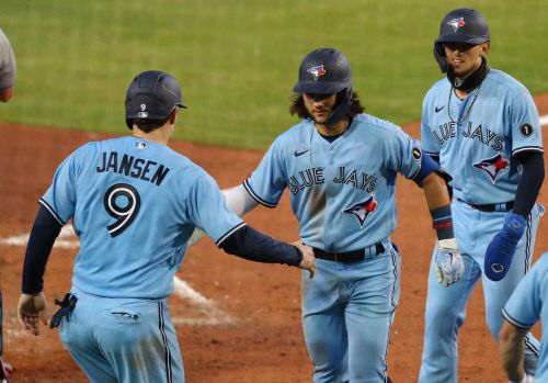 토론토 유격수 보 비셋(가운데)이 12일(한국시간) 미국 뉴욕주 버팔로 샬렌필드에서 열린 마이애미와 홈경기에서 3점 홈런을 친 후 홈으로 들으오고 있다. 버팔로 | USA투데이 연합뉴스 |