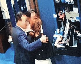 지난 5일 오후 부산 사하구 한 식당에서 더불어민주당 부산시의원 A씨가 여직원 B씨의 어깨에 손을 얹고 있다. /김소정 변호사 |