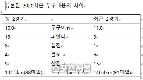 첫 2경기에서 10이닝을 던지는 동안 13안타를 허용하고 8실점에 볼넷 4 삼진 9개를 빼앗았다. 최근 2경기는 11이닝에 3안타 1실점 볼넷 5 삼진 15개를 기록했다. 투구내용에서 큰 차이를 보인다. 첫 2경기의 구위가 밋밋했다면 최근 2경기는 위력적이고 날카로웠다. 애틀랜타전에서는 체인지업, 2020시즌 살렌필드 개막전에서는 포심 패스트볼과 컷패스트볼이 위력을 떨쳤다.
