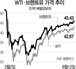 12일(현지시간) 뉴욕상업거래소(NYMEX)에서 9월 인도분 서부텍사스산원유(WTI) 가격은 전 거래일보다 배럴당 2.6%(1.06달러) 오른 42.67달러를 기록했다. 세계 유가 벤치마크인 브렌트유도 런던 ICE선물거래소에서 전날보다 2.09%(0.93달러) 상승한 45.43달러에 거래됐다. 두 유종 모두 코로나19발(發) 수요 타격으로 가격이 급락했던 3월 이후 최고치를 경신했다.