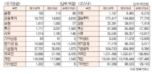 [표]유가증권·코스닥 투자주체별 매매동향(8월 13일-최종치)