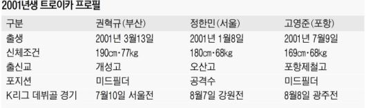 20여년의 세월이 흘러 K리그에 새로운 트로이카가 등장하고 있다. 마치 그 시절처럼 겁 없는 10대들이 한꺼번에 셋이나 그라운드를 누비고 있다. 2001년생으로 나란히 데뷔골을 쏟아낸 권혁규(부산)와 정한민(서울), 고영준(포항)이 그 주인공들이다.