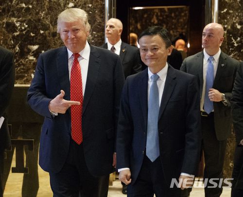【뉴욕 =AP/뉴시스】 중국의 전자상거래업체 알리바바의 창업자 마윈(馬雲)이 지난 2017년 1월9일 미국을 방문해 뉴욕 트럼프 타워에서 도널드 트럼프 대통령을 만나고 있다. |