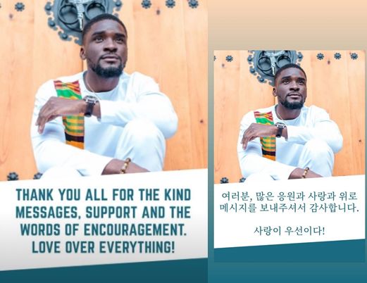 샘 오취리는 14일 인스타그램 스토리에 "여러분, 많은 응원과 사랑과 위로 메시지를 보내주셔서 감사합니다. 사랑이 우선이다!"라며 자신의 사진과 함께 한글과 영어로 메시지를 남겼다.