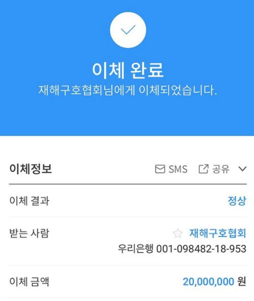 한지혜는 14일 개인 SNS에 재해구호협회에 2000만 원을 기부한 인증 사진을 게재했다.