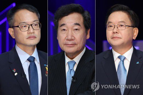 더불어민주당 당 대표 선거에 출마한 박주민(왼쪽부터), 이낙연, 김부겸 후보가 2020년 8월 7일 kbc광주방송에서 열린 광주·전남 권역 방송토론회에 자리한 모습. [연합뉴스 자료사진] |